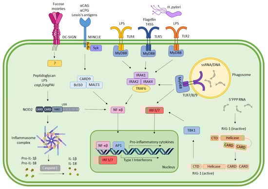 Chicago/Turabian StyleCheok, Yi Ying, Grace Min Yi Tan, Chalystha Yie Qin Lee, Suhailah Abdullah, Chung Yeng Looi, and Won Fen Wong. 2022. "Innate Immunity Crosstalk with Helicobacter pylori: Pattern Recognition Receptors and Cellular Responses" International Journal of Molecular Sciences 23, no. 14: 7561. https://doi.org/10.3390/ijms23147561