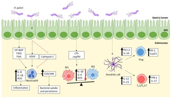 - Algood, H.M.; Gallo-Romero, J.; Wilson, K.T.; Peek, R.M., Jr.; Cover, T.L. Host response to Helicobacter pylori infection before initiation of the adaptive immune response. FEMS Immunol. Med. Microbiol. 2007, 51, 577–586. [Google Scholar] [CrossRef] [Green Version]