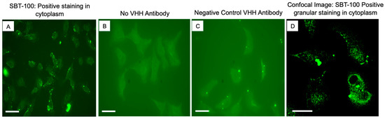 SBT-100 penetrates cell membrane of TNBC cell line, MDA-MD-231. (A) Immunofluorescence staining of MDA-MB-231 cells incubated with SBT-100 antibody showed positive cytoplasmic staining using the anti-His tag antibody in green channel. (B) MDA-MB-231 cells with no VHH antibody were negative. (C) No cytoplasmic positive staining was seen with the negative control irrelevant VHH antibody (anti-HIV 1-reverse transcriptase VHH) with traditional fluorescence microscopy. (D) Confocal image of SBT-100 detection is shown as granular staining located throughout the cytoplasm. The observed staining of SBT-100 in (A,D) is cytosolic and not endocytic. The scale bars in the lower-left corner of each panel represent 100 µm.