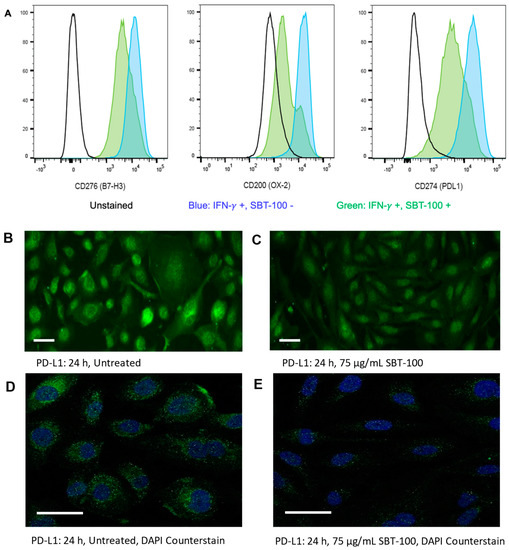 SBT-100 decreases the expression of immune checkpoint inhibitors in various cancer cell lines. (A) Surface expression of checkpoint inhibitors, B7-H3, OX-2, and PD-L1, was determined by flow cytometry in SJSA-1 osteosarcoma cells in the presence or absence of SBT-100, upon stimulation with IFN-γ (75 μg/mL). Fluorescent microscopy of PD-L1 expression in MDA-MB-231 cells without SBT-100 (B) and with SBT-100 (C). Confocal fluorescent microscopy of PD-L1 expression in MDA-MB-231 cells without SBT-100 (D) and with SBT-100 (E), both with the nuclei detection with DAPI. The scale bars in the lower-left corner of panels (B–E) represent 50 µm.