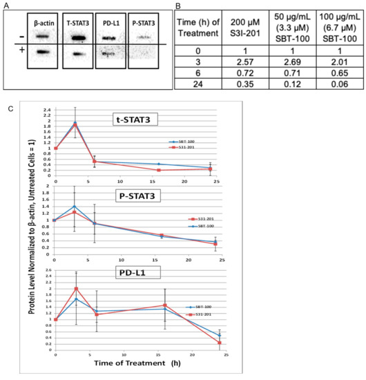 Standard procedures were used for immunoblotting. Primary antibodies were: Anti-β-actin: (Cat. No. 4970, Cell Signaling Technology), Anti-t-STAT3: (Cat. No. 30835, Cell Signaling Technology) Anti-p-STAT3: (Cat. No. 9145, Cell Signaling Technology), Anti-PD-L1: (Cat. No. 13684, Cell Signaling Technology), HRP-Anti-rabbit IgG: (Cat. No. 711-035-152, Jackson ImmunoResearch). Blocking buffer, primary, and secondary antibody diluent 5% BT: (5% BSA in TBS) TBS (Tris Buffered Saline25 mM Tris, 150mM NaCl, pH 7.5) TBST (TBS + 0.1% Tween-20). Briefly, 2 × 105 MDA-MB-231 cells/well were seeded in each well of a 6-well plate and allowed to adhere overnight at 37 °C in a 5% CO2 incubator in media. Media was removed and SBT-100 in media was added. Following incubation for the indicated times, media was removed, the adherent monolayer of cells was washed with ice-cold PBS and then lysis of the cells was performed by scraping the cells in TBS + 0.05% SDS with added EDTA, protease inhibitors, and phosphatase inhibitors. At later times of treatment where non-adherent cells were apparent, these cells were collected by centrifugation, lysis was performed, and combined with the lysate of the adherent cell population.
