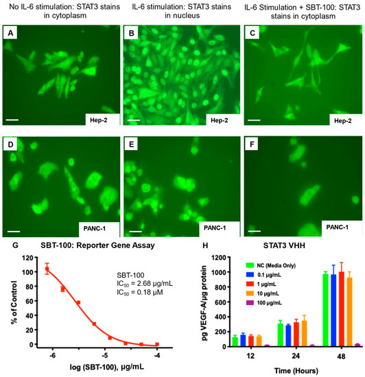 Standard procedures were used for immunohistochemistry and immunofluorescence assay (IFA) staining. Primary antibodies for IFA were: Anti-t-STAT3: (Cat No. 30835, Cell Signaling Technology, Danvers, MA, USA), Anti-p-STAT3: (Cat No. 9145, Cell Signaling Technology), Anti-PD-L1: (Cat No. 13684, Cell Signaling Technology), Anti-VHH Antibody: (Cat. No. 200-401-GM6S, Rockland, Rockland, MA, USA), Alexa Fluor 488-Anti-rabbit IgG: (Jackson ImmunoResearch, West Grove, PA, USA, Cat. No. 711-545-152), rabbit polyclonal anti-GST: (Thermo Fisher #71-7500, Waltham, MA, USA). The blocking solution, 1° and 2° antibody diluent were 1% BP: (1% BSA in PBS). All cell incubations were at 37 °C in a 5% CO2 incubator in media. 4500 cells/well were seeded in chamber slides and allowed to adhere overnight. Cells were treated with SBT-100 at various timepoints and then fixed in 100% methanol at −20 °C. For IFA staining, slides were blocked for ≥30 min with 1% BP, the blocking agent removed, and 1° antibodies were added at the following dilutions prior to overnight incubation at 5 °C: anti-VHH = 1:500, anti-t-STAT3 = 1:300, anti-p-STAT3 = 1:125, anti-PD-L1 = 1:300. Wells were washed with PBS and incubated with Alexa Flour labeled anti-rabbit IgG conjugate (1:300) for ≥1 h prior to washing with PBS, slides were cover slipped and examined by fluorescent microscopy. For DAPI staining, wells were incubated for 7min with 0.143 mM DAPI and washed with PBS prior to the application of a coverslip. Traditional fluorescence microscopy was performed using the Nikon 80i microscope and the appropriate wavelength filter. Images were captured using the attached Spot RT3 camera (Cat. No. WS-RT2540-0484, Spot Market Webstore, Sterling Heights, MI, USA, https://webstore.diaginc.com/) model 25.4, 2Mp slider and the associated Spot 5.1 software.