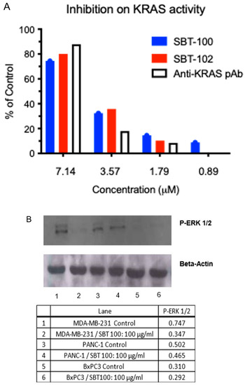 SBT-100 inhibits the GTPase activity of KRAS and stifles downstream ERK phosphorylation in KRAS mutant cancer cells. (A) Luminescence (RLU) was measured as a readout for KRAS GTPase activity. Reagents were incubated with either SBT-100, SBT-102, or anti-KRAS polyclonal antibody, and RLU were measured. (B) Western blot analysis for phosphorylated ERK1/2 in various KRAS mutant cancer cells with and without SBT-100 treatment. In Lane 1 (MDA-MB-231), Lane 3 (PANC-1), and Lane 5 (BxPC3) cancer cells were incubated with a vehicle only. In Lane 2 (MDA-MB-231), Lane 4 (PANC-1), and Lane 6 (BxPC3) cancer cells were incubated with 100 µg/mL of SBT-100 for 72 h.