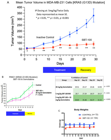 The therapeutic potential for SBT-100 in vivo has been demonstrated here as monotherapy, we have confirmed the efficacy in the form of tumor regression in athymic nude mouse xenograft with TNBC tumors with KRAS(G13D) mutation (at least 50–100 mm3). The therapeutic effect of SBT-100 persisted for at least seven days after the last dose. Similarly, SBT-100 augmented the suppression of tumor growth when combined with gemcitabine. PANC-1 is known to be difficult to treat malignancy since it is KRAS-independent [24]. These experiments suggest that SBT-100 alone or in combination with other chemotherapeutic agents cause significant tumor growth suppression in vivo.