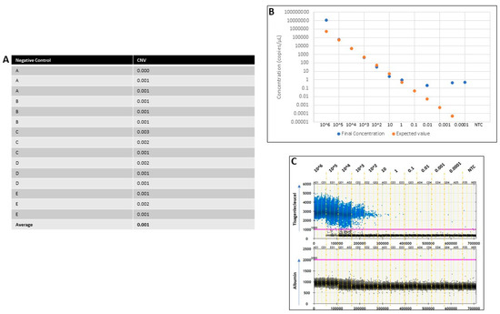To determine the limit of detection (LoD), we ran five (A–E) nonamplifiable controls (NACs) in triplicate. These were tisagenlecleucel-negative and reference gene-positive so that CNV could be calculated for the target. The mean CNV for the controls was 0.001, with a range of 0.000–0.003, demonstrating the limits between CNV detection and background noise. Therefore, the LoD for the CNV of tisagenlecleucel was set to be 0.001 (Figure 1A). The synthetic oligonucleotide was diluted at different absolute copy numbers (with no presence of genomic DNA) from 106 down to 0.0001 copies/µL, including a nontemplate control (NTC) (Figure 1B). This experiment was performed to (i) determine the dynamic range of the ddPCR (previously suggested by the manufacturer, Bio-Rad, to be 1–105), (ii) validate correlation between the observed final concentrations of the samples and the expected values, and (iii) establish the appropriate level of target dilution to use for spiking. The results showed a positive trend between observed and expected values between 1 and 105 copies/µL, demonstrating saturation above 105 and loss of resolution below 1 copy per µL, as expected (Figure 1B). Therefore, 104 copies/µL was established as the most appropriate dilution to be used in the following experiments. This amount demonstrated a good balance and distinction between positive and negative droplets, allowing for a more accurate CNV measurement (Figure 1C). An NTC was used throughout all runs, showing a limit of blank (LoB).