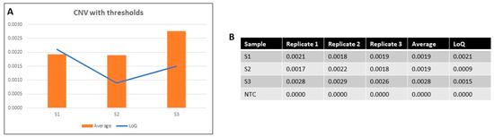 (A) Graph demonstrating the CNV average among triplicates per sample for S1, S2, and S3. The blue line shows the LoQ per sample, based on each patient’s pretreatment sample. S2 and S3 showed higher CNV averages than their corresponding LoQs, demonstrating CAR T persistence. (B) Table showing the detailed CNV numbers per replicate per sample, their averages, and the corresponding LoQs. NTC was run in parallel as a negative control.
