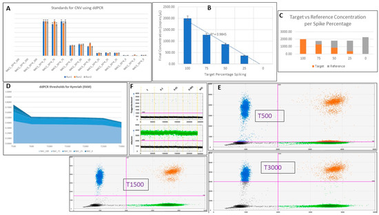 (A) Three separate runs with triplicates of three controls (NAC1, NAC2, and NAC3) spiked with the synthetic oligo at proportions of 100% (no control sample, only tisagenlecleucel), 75%, 50%, 25%, and 0% oligo (100% control sample, no tisagenlecleucel). Each replicate was shown to be consistent between runs (p = 0.998539). (B) Graph demonstrating the correlation between the final concentration (in copies/µL) of the oligo when spiked into the NACs and its corresponding percentage (R2 = 0.9845). (C) Stacked histogram showing the final concentration in copies/µL of target vs. reference in each triplicate experiment of percentage spiking. (D) Area chart showing the accepted range for setting the tisagenlecleucel oligo threshold during analysis. Each NAC spike was run in triplicate for each threshold shown (T500–T3000). (E) Representative data for thresholds set at 500 and 1500 for tisagenlecleucel (FAM channel in blue) in 2D amplitude. (F) Spikes of the 4-1BB-CAR oligo in control genomic DNA (NACs) at realistic copies down to 0.001. A detailed table with all events can be seen in Table A1. CAR T positive events were detected, but at very low levels. NTC was shown to be zero, as expected.