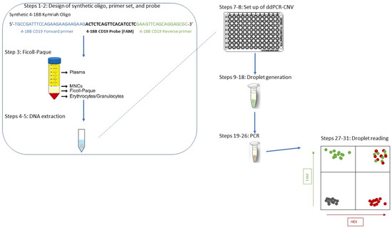 To summarize, a novel ddPCR approach for tisagenlecleucel CAR T cell detection in patient samples is presented, describing the LoD and LoQ of the test, the controls required, and a step-by-step guide suitable for use in a routine clinical laboratory setting (Appendix D). General ddPCR advice is also provided for this method to be adapted for accurate quantification of other CAR T cells, much needed in this rapidly advancing field. This level of “real-time” monitoring in essential for this important group of patients in order to predict outcomes and plan interventions in a timely fashion. The power of the technique developed herein stems from the limited sample needed (crucial for patients from whom only small volumes can be taken) combined with the limits of detection and quantification alongside the high accuracy of the results provided. In parallel to previous studies based on the development of a ddPCR technique to monitor CAR T cells [13,14,15,17,18,20,21], this paper emphasizes the importance of the technique, especially for pediatric patients, for whom sampling is usually limited. Moreover, a PBMNC sample can be used without loss of sensitivity, and we showed here that a BMA sample was not necessary for the accurate measurement of CNV (Figure 5C) and that there was no need for CD3+ T cell isolation (Figure 5B) for the tisagenlecleucel target, reducing sample processing times and costs. The methodology described here has now been successfully used in more than 150 samples from children, and a schematic of the procedure can be seen in Figure 6.