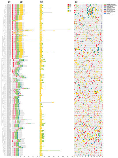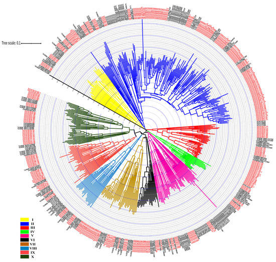 Multiple sequence alignments for SAUR full-length protein sequences of Arabidopsis, rice, maize, sorghum, and wheat were performed using the Multiple sequence alignment version 3 (MUSCLE v3) (http://www.drive5.com/muscle/ (accessed on 22 January 2022)). On the basis of the neighbor-joining method, a phylogenetic tree was constructed for SAUR proteins by using the software MEGA 7.0. The bootstrap test was carried out using 1000 replicates to construct the reliability of the tree. A midpoint rooted base tree was produced using the Interactive Tree of Life (iToL, version 6.4.2, https://itol.embl.de (accessed on 22 January 2022)).
