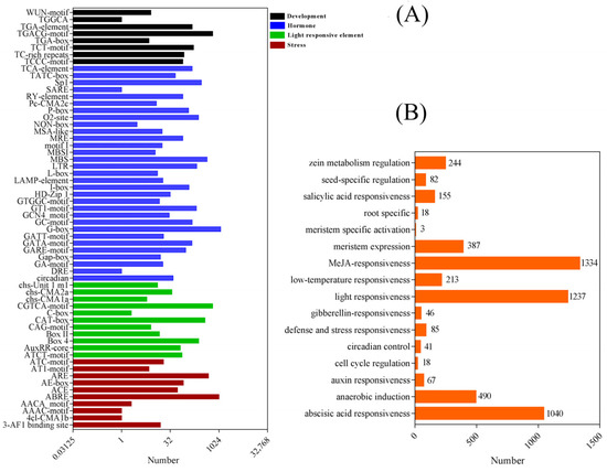 Overview of the main types of cis-elements in the TaSAUR gene promoters. (A) The number of each type of cis-elements identified in the promoter regions. (B) The number of cis-elements identified in the promoter regions in each category.