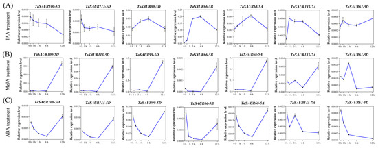 TaSAUR100-5D, TaSAUR113-5D, TaSAUR99-5D, TaSAUR66-5B, TaSAUR68-5A, and TaSAUR143-7A were up-regulated after 6 h MeJA application and reached the maximum expression levels at 12 h. While the expression of TaSAUR61-5D was up-regulated at first, it then down-regulated, reaching the peak at 3 h and lowest at 6 h, and then increased gently (Figure 4B). For ABA treatment, the expression of TaSAUR100-5D, TaSAUR113-5D, TaSAUR99-5D, TaSAUR66-5B, and TaSAUR68-5A were down-regulated at 0–6 h and then up-regulated continuously. TaSAUR143-7A and TaSAUR61-5D were down-regulated and reached the lowest point at 12 h (Figure 4C). The expression of TaSAUR100-5D, TaSAUR113-5D, TaSAUR99-5D, TaSAUR66-5B, and TaSAUR68-5A were up-regulated by exogenous ABA or MeJA, but there were differences in expression levels. TaSAUR61-5D was down-regulated by ABA or MeJA at 12 h, which may play a negative role in stress responses. The expression pattern of TaSAUR143-7A changed dynamically under the two conditions, but the relative expression level was opposite at 12 h; that is, it was down-regulated by ABA and up-regulated by MeJA, suggesting that MeJA may be the main signal pathway for the positive regulation of the TaSAUR143-7A gene under adverse conditions.