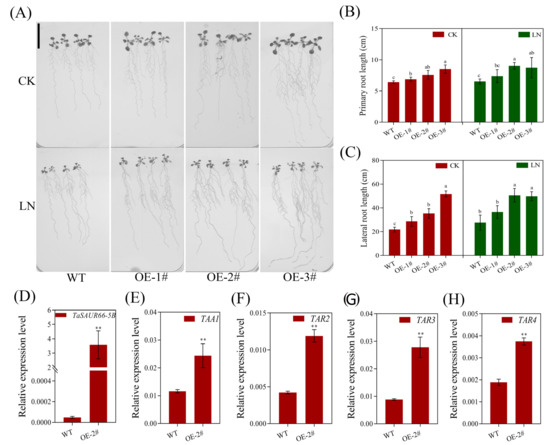 Since the response of TaSAUR66-5B to auxin is the most significant one among the seven investigated TaSAUR genes, and it can respond to low nitrogen stress based on one of our microarray analyses, we, therefore, performed further analysis on it. Firstly, we examined the expression levels of TaSAUR66-5B in the roots of a pair of wheat isogenic lines, i.e., 178A and 178B [27]. We found that the expression of TaSAUR66-5B was significantly higher in the long-root line 178B, compared to that in the short-root line 178A, and significantly up-regulated in both 178A and 178B under low nitrogen conditions. The expression levels increased by 60.1 times in 178B under low nitrogen, while they increased by 3.88 times in 178A (Supplementary Figure S2). These results indicated that TaSAUR66-5B might be involved in the regulation of wheat root growth and low nitrogen adaption. Then, we generated overexpression lines of TaSAUR66-5B in Arabidopsis and wheat and RNAi lines in wheat to further probe its biological function (Figure 5A and Figure 6A). Phenotypic analysis of homozygous T3 Arabidopsis transgenic lines showed that the primary and lateral roots of transgenic plants were significantly longer than those of WT under both low nitrogen (LN) and normal nitrogen (CK) conditions (Figure 5A–C), thus indicating that overexpression of TaSAUR66-5B in Arabidopsis significantly promoted the root growth of transgenic plants. We examined the expression levels of four key genes (TAA1, TAR2, TAR3, and TAR4) involved in auxin biosynthesis. Results showed that the relative expression levels of the four examined genes were all significantly up-regulated in the TaSAUR66-5B overexpressed lines (Figure 5D–H). Taken together, TaSAUR66-5B may enhance root growth by promoting auxin biosynthesis.