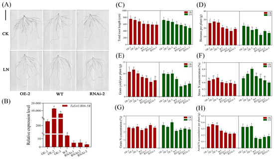 Similarly, overexpression of TaSAUR66-5B in wheat also significantly promoted the root growth of transgenic plants under both LN and CK conditions (Figure 6A–C). However, the effects of underexpression of TaSAUR66-5B on root growth in RNAi plants is not significant (Figure 6C). The most likely reason is that there are a large number of TaSAUR gene family members and the presence of function redundancy in hexaploid wheat. In the field trial, the biomass and grain yield of TaSAUR66-5B overexpression lines were significantly higher than those of WT under both LN and CK conditions (Figure 6D,E). The biomass increased by 24.62–33.32% under CK and 15.50–20.28% under LN conditions. The grain yield increased by 18.17–37.59% under CK and 27.96–30.76% under LN conditions. The TaSAUR66-5B underexpression lines (RNAi lines) had significant lower biomass and grain yield than those of WT under LN conditions but no significant lower biomass and grain yield under CK. To investigate whether TaSAUR66-5B can improve the nitrogen use efficiency (NUE) in wheat, we measured the nitrogen concentration of the straw and grains of TaSAUR66-5B transgenic lines and calculated the nitrogen accumulation based on straw biomass and grain yield. Results showed that the nitrogen concentration and nitrogen accumulation in the straw and grains of almost all overexpression lines were significantly higher than those of WT, especially under LN conditions (Figure 6F–H). These results suggest that overexpression of TaSAUR66-5B can improve wheat growth performance, yield, and NUE, especially under LN conditions. Similar to the effects on root growth, underexpression of TaSAUR66-5B on nitrogen uptake in most RNAi plants is not significant, which, once again, indicates the possible functional redundancy among the TaSAUR gene family members.