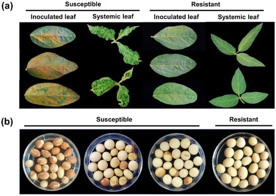 Soybean (Glycine max L. Merr.), the most important legume crop in the world, is an essential and dominant source of protein for humans and animals []. Various biotic and abiotic stresses could affect the yield and quality of soybeans. Among the biotic stresses, infection by some plant viruses, such as soybean mosaic virus (SMV), bean pod mottle virus (BPMV), soybean vein necrosis virus (SVNV), tobacco ringspot virus (ToRSV), and alfalfa mosaic virus (AMV), causes great damage to soybean production [,]. SMV is the most frequent and dangerous virus infecting soybeans, causing production losses of up to 50% [].