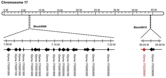 Resistance to seed coat mottling differs in CSSLs due to differences in chromosomal substituted segments and wild soybean genomic data. Hence, we aimed to evaluate the chromosomal region underlying the phenotypic variation. The genomic regions associated with resistance to seed coat mottling were identified by QTL analysis based on the incidence rates of seed coat mottling of the 185 CSSL lines which could be systemically infected with SMV N3. According to the obtained data, only two QTLs were found on chromosome 17, and both were located at the end of chromosome 17 (Figure 2). Block9566 and Block9910 were the two substituted regions on chromosome 17, with logarithmic odds ratios (LOD) of 2.50 and 7.90, respectively (Table 1). The Block9566 of about 141 kb represented 4.57% of observed phenotypic variation and contained 16 annotated genes according to the reference genome GlymaWm82.a2.v1 annotations (Figure 2; Table S1). The Block9910 was about 24 kb and contained two annotated genes, Glyma.17g238900 and Glyma.17g239000, which accounted for 14.66% of observed phenotypic variation (Figure 2; Table S1).