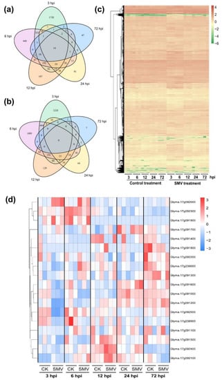 Transcriptome analysis of soybean cultivar SN14 in response to SMV infection. Venn diagram of upregulated (a) and downregulated (b) differentially expressed genes (DEGs) at 3, 6, 12, 24, and 72 h post-inoculation (hpi); heatmaps of all DEGs (c) and candidate genes (d) in the regions identified by QTL.
