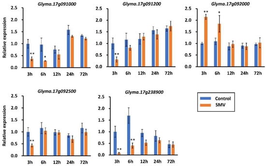 Expression profiling of candidate genes for resistance to seed coat mottling in soybean cultivar SN14 in response to SMV N3 strain. The y-axes indicate the relative expression levels between samples infected with SMV and control samples inoculated with PBS buffer; the x-axes indicate the time points post-inoculation; the * and ** indicate significant differences at p < 0.05 and p < 0.01, respectively, based on Student’s two-tailed t-test using SPSS 12.0.