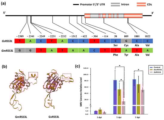 (a) Gene structures and single-nucleotide polymorphisms (SNPs) of GmRSS3L and GsRSS3L; (b) predicted three-dimensional structures of protein GmRSS3L and GsRSS3L, as well as the α-helix region that may be affected by the two nonsynonymous mutants, as indicated by the red box; (c) qRT-PCR quantification of SMV genomic RNA in Nicotiana benthamiana leaves with transient expression of SMV infectious clone with GmRSS3L, GsRSS3L and empty vector of pCambia3301 as control, at 3, 5, 7 days post-inoculation (dpi). The * indicates a significant difference at p < 0.05.