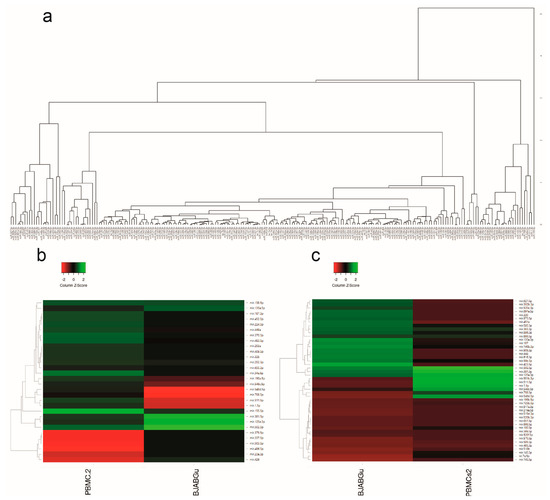 By applying a fold change (FC) threshold greater than 1 log10 in both directions (up and down) 30 and 46 miRNAs in HTLV-2-infected PBMCs and BJABGu cells, respectively, were found. Figure 1 displays the heat map of 30 miRNAs whose expression levels varied by at least 1 log10 (FC) in HTLV-2-infected PBMCs compared with BJABGu (Figure 1b) and the heat map of 46 miRNA with at least 1 log10 (FC) in BJABGu compared with HTLV-2-infected PBMCs (Figure 1c).