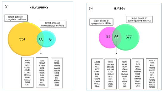 Target genes of deregulated miRNAs. The Venn diagram indicates the target genes of differentially expressed (down or upregulated) in HTLV-2-infected PBMCs (a) and BJABGu (b). The target genes that are common between the two groups are listed in the boxes.