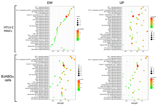 Bubble plot of the KEGG pathway enrichment of the target genes. The strength of the enriched signaling pathways associated with the target genes of the downregulated (DW) miRNAs (left panel) and upregulated (UP) miRNAs (right panel) in HTLV-2 infected PBMCs (upper panel) and BJABGu cells (bottom panel). The size and color of each bubble represent the number of target genes in each pathway and its corresponding p-value, respectively.