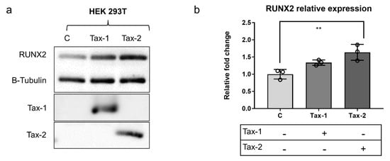On the left (a), representative Western blot analysis of the HEK293T control cells and cells transfected with Tax-1 pJFE or Tax-2 pJFE showing an increase in RUNX2 protein expression in cells transfected with the HTLV-2 Tax protein. On the right (b), histogram bars represent the densitometric analysis of the Western blot bands corresponding to RUNX2 normalized to tubulin. ** = p value < 0.01 using one-way ANOVA; c = control non-transfected cells; Tax-1 = cells transfected with Tax-1 pJFE; Tax-2 = cells transfected with Tax-2 pJFE.