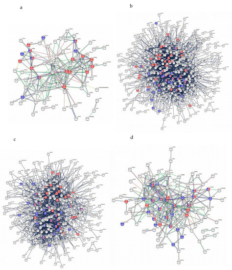 Analysis of PPIs of the target genes of miRNAs down regulated and upregulated in infected PBMCs ((a,b) respectively) and BJABGu cells ((c,d) respectively) related to HIV-1 and HTLV-1 annotations. Red nodes are associated with HTLV-1 infection, while blue nodes are associated with HIV-1 infection. Double coloured nodes share both annotations (genes name are listed in Supplementary S2).