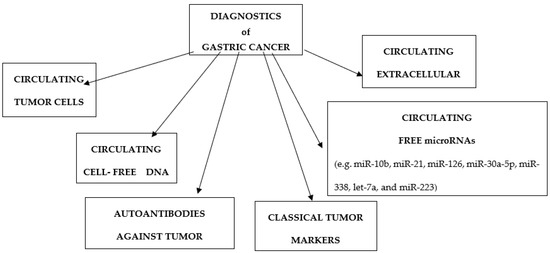 Gastric cancer (GC) is one of the leading causes of cancer morbidity and mortality in the world. Each year, there are still over a million newly diagnosed cases and deaths due to stomach cancer despite the decline in incidence. The incidence rates vary significantly across the globe, being the highest in Eastern Asia, followed by Eastern and Central Europe while rates are the lowest in North America and Western Africa [1]. Although the main type of GC is adenocarcinoma (approximately 95%), gastric cancer is genetically and biologically heterogeneous with a poorly understood carcinogenesis at the molecular level. A relatively small percentage of GC cases is associated with nutritional factors and genetic predisposition, and the main risk factors are the presence of precancerous lesions (dysplasia) and chronic H. pylori infection [2,3]. The survival rate depends on the stage of gastric cancer at the time of the diagnosis. In Japan survival rate was found to be about 50%, whereas in Western countries the 5-year survival ranged from 5–20% due to late diagnosis [4]. As patients with early GC typically have no symptoms, they often miss the opportunity for optimal treatment. Although surgical resection, along with chemotherapy and radiotherapy, is more effective than surgery alone in patients with early-stage gastric cancer, patients often present with late-stage cancer at initial diagnosis due to the absence of clinical symptoms which could have enabled early detection [5]. Gastroscopy with biopsy is an appropriate method assisting in the diagnosis of specific early gastric tumor types; but the stress caused by this invasive method together with the fact that it is very expensive, make it difficult to use it as a routine method of screening for gastric cancer [6]. A prerequisite for reducing mortality and improving treatment in gastric cancer patients is early detection and monitoring of tumor dynamics [2]. So, it is still a huge challenge to detect gastric cancer at the early stages because of the vacancy of specific detection tests. Hence, there is a great need to discovery biomarkers for the non-invasive early detection of gastric cancer patients. As detection of blood tumor markers are more convenient than other approaches, they are widely applied in the early diagnosis of gastric cancer. There have been lots of investigations to find the accurate serum and tumor biomarkers to detect gastric cancer. However, the sensitivity and specificity of currently used serum biomarkers for GC detection are unfavorable. In addition, relevant markers for monitoring prognosis have not yet been identified. Therefore, the first imperative is to investigate new effective GC biomarkers to aid in early diagnosis and guide treatment planning [2]. Biomarkers are characteristics that are objectively evaluated and measured as an indicator of normal or pathological biologic processes or pharmacological response to therapy [7]. Commonly used tumor markers are carcino-embryonic antigen (CEA), carbohydrate antigen (CA 19-9), and carbohydrate antigen 72-4 (CA72-4). However, none of them demonstrates a high level of diagnostic accuracy [8]. Recent research to identify GC biomarkers has resulted in the discovery of a wide variety of cancer-related molecules, including various proteins, circulating free microRNAs (cfmiRNAs), circulating cell-free DNA (cfDNA), circulating tumor cells (CTCs), autoantibodies against tumor associated antigens (TAAs), and cancer-derived extracellular vesicles (EVs) (Figure 1, Table 1) [9].