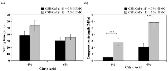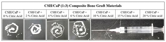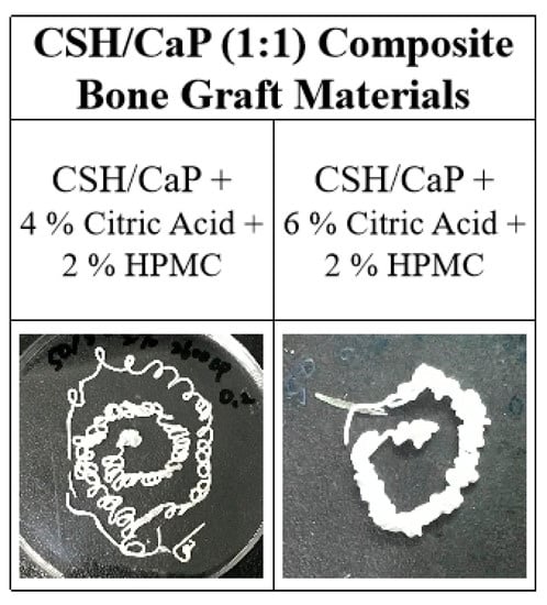 - Thai, V.V.; Lee, B.T. Fabrication of calcium phosphate-calcium sulfate injectable bone substitute using hydroxy-propyl-methyl-cellulose and citric acid. J. Mater. Sci. Mater. Med. 2010, 21, 1867–1874. [Google Scholar] [CrossRef] [PubMed] [Green Version]