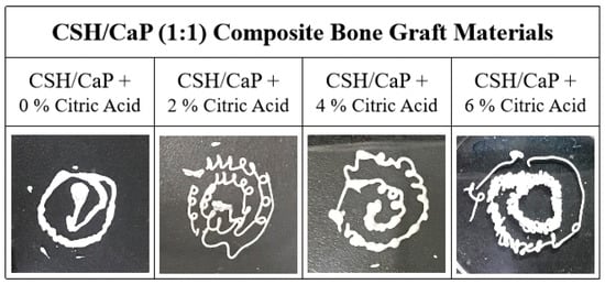 | Powder component | CSH/CaP + 0% Citric Acid | CSH/CaP + 2% Citric Acid | CSH/CaP + 4% Citric Acid | CSH/CaP + 6% Citric Acid |