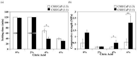 - Sarda, S.; Fernández, E.; Nilsson, M.; Balcells, M.; Planell, J.A. Kinetic study of citric acid influence on calcium phosphate bone cements as water-reducing agent. J. Biomed. Mater. Res. 2002, 61, 653–659. [Google Scholar] [CrossRef] [PubMed]