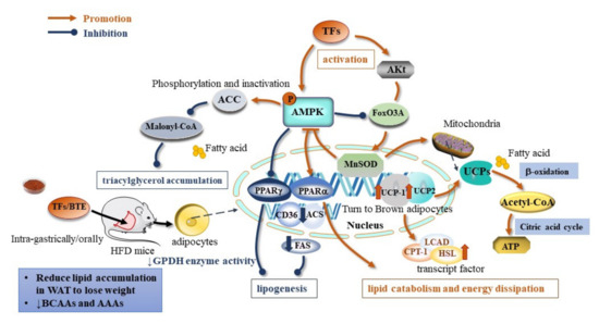 TFs are associated with lipolysis through the AMPK–FoxO3A–MnSOD pathway. The transfection of 3T3-L1 adipocytes with a reporter gene constructed from GFP driven by the superoxide dismutase (MnSOD) promoter leads to the upregulation of peroxisome proliferator-activated receptor γ (PPARγ) and PPARα, while it downregulates the expression of the CD36, ACS, and FAS genes. TF3 increases CPT-1, LCAD, and HSL transcript levels, and promotes the expression profile of genes that favor lipolysis and β-oxidation, i.e., genes that induce energy-dissipation-related genes and brown-fat-related proteins: mitochondrial uncoupling protein-1 (UCP-1) and UCP-2 [38] (Table 1). The family of UCPs are mitochondrial inner membrane carriers that regulate electrochemical potential and dissipate energy in the form of heat [39]. Among them, UCP-2 is specific to white adipocytes, and functions similarly to brown adipocyte-specific UCP-1. The induction of UCP-1 and UCP-2 in adipose tissue increased systemic energy expenditure and alleviated metabolic disturbances [40].