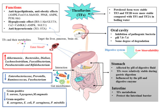 Bioavailability regards to the proportion of the particular nutrients that are digested, absorbed, and metabolized through normal pathways [18]. TFs are relatively stable during in vitro gastric digestion, which is majorly influenced by pH and digestive enzymes [19]. The effects of pH on the stability of TFs were documented above. In the intestinal phase, TFs exhibited poor bioavailability with apparent permeability coefficient (Papp) values ranging from 0.44 × 10−7 to 3.64 × 10−7 cm/s [20]. In addition, P-glycoprotein (P-gp), multidrug resistance-associated proteins (MRPs), and breast-cancer resistance proteins (BCRPs) are all involved in the efflux transport of the four TFs, of which P-gp and MRPs have the strongest secretory effect on TFs [20]. Intestinal microbial communities are capable of enzymatically transforming compounds into metabolites, thus potentially affecting their bioavailability [21]. However, the bioavailability of TFs has received limited attention in comparison with that of green tea polyphenols.