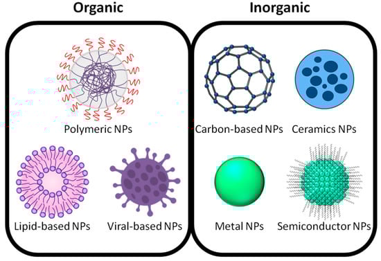 Different types of NPs. Organic NPs: polymeric NPs, lipid-based NPs, and viral-based NPs; inorganic NPs: carbon-based NPs, metallic NPs, ceramic NPs, and semiconductor NPs.