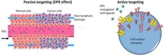 NPs can function through active or passive therapeutic targeting (Figure 2) []. After the passive nano-delivery mode, the charged therapeutic agent is released by corrosion or diffusion of the delivered nanocarrier. The active mode of administration allows the controlled release of the transported biomolecules to the target body part. In this mode of delivery, certain cell surface receptors or biomolecules are used as biomarkers to reach specific target sites []. By combining specific stimulus–response components, it is also possible to selectively target specific tissues or body parts, which may be triggered by specific stimuli, such as electric or magnetic fields, light, pH, heating, ultrasound, and contact with concentrated solutions, ionic solutions, or certain enzymes [].
