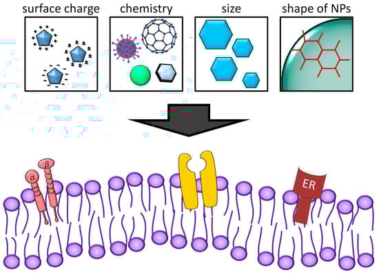 Studies have been attempting to establish a correlation between NP material-specific parameters and cell uptake, in addition to cell physiological response and survival. The surface charge, chemistry, size, and shape of NP affect their cellular uptake (Figure 3). The surface charge-induced cytotoxicity of NP was the result of Coulombic interactions []. The negatively charged plasma membranes attracted positively charged NPs, to cause membrane destruction and proton pump effects [,]. For example, positively charged AuNPs maximally depolarize cell membranes, while other charged NPs have negligible effects []. When looking at truly insoluble particles, the effects of their physical presence and adsorption properties need to be considered. The physical presence of particles within macrophages affects the function of macrophages and may affect macrophages’ moving due to excess particles. The effects on macrophage mobility begin when about 6% of the cell volume is occupied by particles []. Interestingly, when NPs are involved, dyskinesias occur at a lower percentage of occupancy []. One possibility is that a key factor involved in the disruption of intracellular actin function is the total surface area of intracellular particles []. Impaired cell motility and function can lead to changes in necrosis. The frustrating phagocytotic process observed in macrophages probably provides more examples of asbestos fibers than can be up-taken. Studies by Poland et al. indicated that when macrophages encounter long carbon nanotubes, impaired cell motility and function of phagocytosis occur [,]. Adsorption of NP components into the extracellular space may also occur [,].
