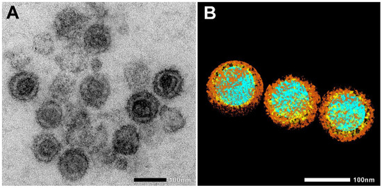 Electron microscopic images of heat-inactivated SARS-CoV-2. (A) Native electron microscopic image. (B) For the visualization of SARS-CoV-2 morphology, regions of interest, such as nucleic acid (blue), nucleocapsid (yellow), and spike proteins (brown), were segmented manually. Scale bar 100 nm.