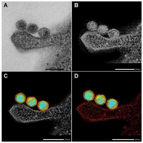 Creating a 3D electron tomography. (A) SARS-CoV-2 particles bound by an invading RAW macrophagen at 10 min of incubation at 37 °C. Scale bar 200 nm. (B–D) The images presented are utilized to create a 3D electron tomography. Regions of interest, such as nucleic acid (blue), nucleocapsid (yellow) spike proteins (brown), and the neighboring macrophage (red), were segmented manually.