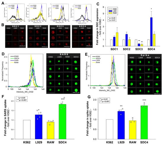 Flow cytometric assessment of SDC expression and SARS-CoV-2’s and its spike protein’s uptake in human and murine cell lines. SDC expression of L929, RAW, and K562 cells was analyzed with imaging flow cytometry using fluorescently labeled SDC antibodies. (A,B) Representative flow cytometry histograms and fluorescent images showing SDC expression levels in L929, RAW, and K562 cells. Scale bar = 20 μm. (C) Detected SDC expression level cells were normalized to K562s. The bars represent the mean + SEM of three independent experiments. Statistical significance was assessed with analysis of variance (ANOVA). * p < 0.01; ** p < 0.001. (D–G) L929, RAW, and K562 cells and SDC4 transfectants (created in K562 cells) were incubated with either inactivated SARS-CoV-2 (at 1 MOI) or spike protein (50 nM) for 3 h at 37 °C. After incubation, the cells were washed, trypsinized, fixed, permeabilized, and treated with antibodies specific for the spike glycoprotein (and AF 488-labeled secondary antibodies). Cellular uptake of SARS-CoV-2 and spike was then analyzed with imaging flow cytometry. (D,E) Representative flow cytometry histograms and fluorescent images showing the intracellular fluorescence of SARS-CoV-2- and spike-treated cells. Scale bar = 20 μm. (F,G) Detected fluorescence intensities were normalized to SARS-CoV-2- or spike-treated K562 cells as standards. The bars represent the mean + SEM of four (F) and three (G) independent experiments. Statistical significance vs. standards was assessed with ANOVA. * p < 0.05; ** p < 0.01; *** p < 0.001.