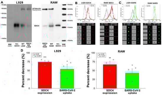 Effect of SDC4 knockdown (KD) on the internalization of inactivated SARS-CoV-2 into L929 and RAW cells. SDC4 KD in L929 and RAW cells was performed using a lentiviral vector specific to mouse SDC4. (A) Western blot validation of SDC4 kD in L929 and RAW cells. β-tubulin was used as a loading control. (B) SDC4 expression levels were also measured with imaging flow cytometry, as shown by the representative histograms and cellular images. Scale bar = 20 μm. Detected SDC4 levels of KD cells were normalized to WT cells as standards. (C,D) WT and SDC4 KD cells were incubated with inactivated SARS-CoV-2 (1 MOI) for 3 h at 37 °C. After incubation, the cells were washed, trypsinized, fixed, permeabilized, and treated with antibodies specific for the spike glycoprotein (and AF 488-labeled secondary antibodies). Cellular uptake of SARS-CoV-2 and spike was then analyzed with imaging flow cytometry. (C) Representative flow cytometry histograms and cellular images show the intracellular fluorescence of SARS-CoV-2-treated WT or SDC4 KD cells. Scale bar = 20 μm. (D) The effect of SDC4 KD on SDC4 expression and SARS-CoV-2 uptake expressed as percent decrease. The bars represent the mean + SEM of three independent experiments. Statistical significance vs. controls was assessed with ANOVA. * p < 0.05; ** p < 0.01; *** p < 0.001.