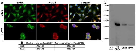 Next, we explored the colocalization of SARS-CoV-2 with SDC4 during uptake into L929 and RAW cells (Figure 6A,B). Taken at 3 h of incubation with inactivated SARS-CoV-2, confocal microscopic studies revealed a high degree of overlap (expressed with the Manders overlap coefficient (MOC) in Figure 6A,B) and excellent correlation (see Figure 6B’s Pearson correlation coefficient (PCC)) between SARS-CoV-2 and SDC4 in both cell lines (Figure 6A,B). Co-immunoprecipitation also confirmed that the inactivated SARS-CoV-2 binds to SDC4 of L929 and RAW cells (Figure 6C).