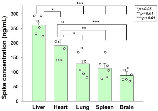 After assessing the in vitro cellular uptake of inactivated SARS-CoV-2, we analyzed its in vivo biodistribution in WT mice. Inactivated SARS-CoV-2 particles were injected intravenously (i.v.) into 12-month-old C57BL/6 mice. After 3 h of incubation, the mice were anesthetized, and blood was collected with cardiac puncture. After transcardial perfusion with ice-cold PBS (2 mL/min, 8 min), the brain, the heart, the liver, the lung, and the spleen—organs validated for their SDC4 expression by the Human Protein Atlas—were removed and frozen in dry ice for further examinations [36,37,38]. According to the Human Protein Atlas, SDC4 expression is highest in the liver, the lung, and the brain, while the heart muscle shows medium and the spleen exhibits modest SDC4 expression (Supplementary Table S1). The extent of SARS-CoV-2 internalization—as measured with a SARS-CoV-2 spike-specific ELISA—reflected not just the route that i.v. administered particles follow after administration, but also the SDC4 tissue expression. As shown in Figure 7, significantly more SARS-CoV-2 particles were taken up by the liver than the other tissues. The heart also accumulated more SARS-CoV-2 particles than the lung, the spleen, and the brain. The brain internalized the heat-inactivated viral particles the least among the investigated organs. However, the difference of the measured spike concentrations between the lung and the brain was not significant, showing the substantial amount of SARS-CoV-2 entering the brain (Figure 7). Spike concentrations in the organs of untreated controls were marginal and about in the range of the standard error of the means of the SARS-CoV-2-treated animals (Supplementary Figure S7).