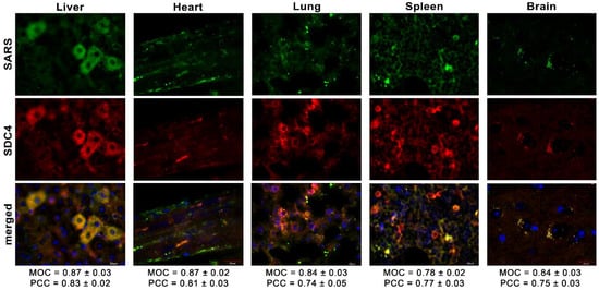 Colocalization of SDC4 with SARS-CoV-2 in various organs of the mice. Liver, heart, lung, spleen, and brain samples of mice receiving i.v. administration of inactivated SARS-CoV-2. Tissue SDC4 is detected with an APC-labeled SDC4 antibody, while SARS-CoV-2 with an AF 488-labeled spike antibody. Scale bar = 20 μm. MOC ± SEM and PCC ± SEM for the overlap and colocalization of SARS-CoV-2 with SDC4 were calculated by analyzing 18 images from 3 samples of each animal.