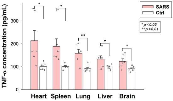 Inactivated SARS-CoV-2 raises TNF-α concentrations in various organs. TNF-α concentrations of the brain, heart, liver, lung, and spleen extracts of SARS-CoV-2-treated and untreated mice were measured with a mouse TNF-α ELISA kit. Each group contained 6 animals. The bars represent the mean + SEM. Statistical significance vs. untreated controls was assessed with ANOVA. * p < 0.05; ** p < 0.01.