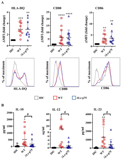 After recognizing pathogens, the highly phagocytic, immature DCs transform into a cell type that has the characteristics required for the activation and polarization of Th cells in different directions. One of the unique features of dendritic cells is the migration to the secondary lymphoid organs to activate naïve Th cells and provide costimulation simultaneously with the antigen presentation via MHCII molecules [20]. Therefore, an increased level of HLA-DQ, CD80, and CD86 co-stimulatory molecules is considered a good marker of stimulated DCs that are capable of T cell activation. After a 24 h incubation, the WT L. casei and ∆Lc-p75 mutant derivative induced the upregulation of HLA-DQ, CD80, and CD86 expression of moDCs, regardless of the mutation (Figure 2A).