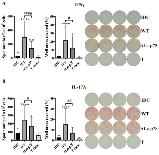 The T-cell-polarizing potential of moDCs is modulated by Lc-p75 inactivation in L. casei BL23. Five-day moDCs activated with wild-type (WT) and ∆Lc-p75 mutant L. casei BL23 were washed and then cocultured with autologous T cells from freshly isolated PBLs at a ratio of 1:20 for 3 days. The frequency of cytokine-producing T lymphocytes was measured using IFN-γ (A) or IL-17A (B) ELISPOT assays. The spot number was counted, or the area covered by the spots was calculated using a computer-assisted ELISPOT image analyzer. The mean value of spot numbers and well areas covered were calculated from 5 independent experiments with 4–6 parallel wells ±SD. One-way ANOVA followed by Tukey’s multiple-comparison test was used for statistical analysis. Significance was defined as * p < 0.05, ** p < 0.01 and **** p < 0.0001 compared to control, non-treated cells (IDC). The differences between WT and ΔLc-p75 were statistically significant and defined as # p < 0.05, ## p < 0.01, and #### p < 0.0001.