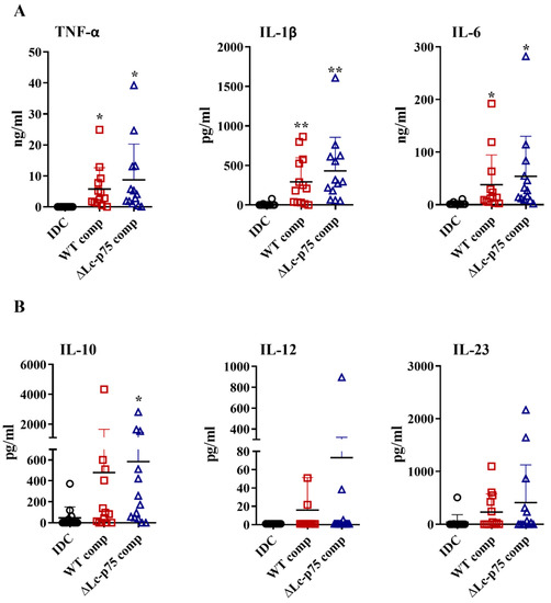 PG derived from wild-type (WT) L. casei BL23 and ∆Lc-p75 mutant strains induces enhanced cytokine secretion by moDCs independently of the PGH mutation. Five-day moDCs were treated with 10 μg/mL PG components derived from WT and Lc-p75 mutant strains for 24 h. The concentrations of TNF-α, IL-1β, and IL-6 proinflammatory cytokines (A) and of IL-10, IL-12, and IL-23 T-cell-polarizing cytokines (B) were determined using ELISA. The mean of the concentrations was calculated from 11–13 independent experiments. Each dot represents one donor. Student’s paired two-tailed t-test was used in the statistical analysis, with significance defined as * p < 0.05 and ** p < 0.01 compared to the control, nonactivated cells (IDC).