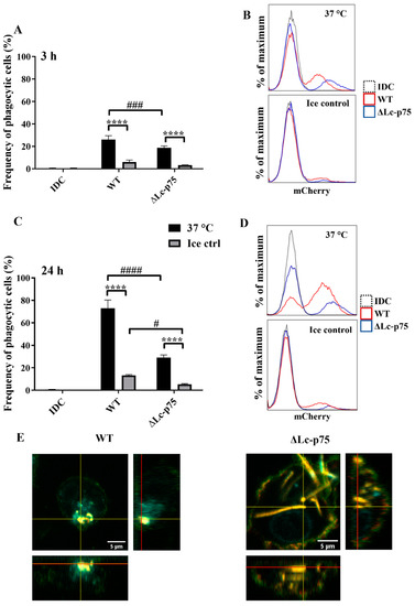 We found that WT bacteria were internalized with higher frequency by moDCs than mutant bacteria after 3 (Figure 5A,B) and 24 (Figure 5C,D) hours. The control samples incubated on ice exhibited a low percentage of mCherry-positive cells. The significantly higher frequency of mCherry-positive moDCs coincubated with WT L. casei BL23 at 37 °C indicated active, temperature-dependent internalization of bacteria within a 3 h incubation period (Figure 5A,B) and after 24 h of coincubation (Figure 5C,D). We confirmed the moDC-mediated uptake of WT and ΔLc-p75 mutant (Figure 5E) bacteria using confocal microscopy displaying orthogonal views of the Z-stack images.