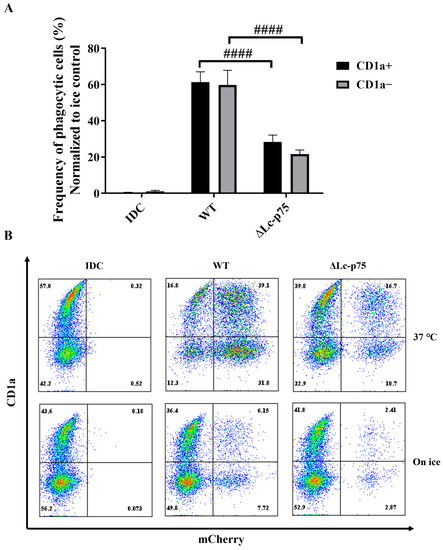 Phagocytic efficiency of moDCs activated with L. casei bacteria is independent of the CD1a expression. Five-day moDCs were stimulated with mCherry-labeled WT L. casei BL23 and ∆Lc-p75 mutant bacteria for 24 h at 37 °C and on ice. The phagocytic capacity of CD1a+ and CD1a− subsets was measured by detecting mCherry-positive moDCs with flow cytometry (A). IDC represents the sample without any bacterial treatment. The frequency of phagocytic cells was normalized to ice control, and the mean values of 3 independent experiments are presented ±SD. (B) Dot plots from one experiment showing the CD1a and mCherry expression of moDCs. Two-way ANOVA followed by Tukey’s multiple-comparison tests were used in the statistical analysis. Differences between WT and ΔLc-p75 were statistically significant, and defined as #### p < 0.0001.