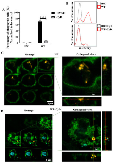 To further investigate whether phagocytosis was the essential step in activating moDCs by WT L. casei BL23, we inhibited actin polymerization, the early steps of phagocytosis, using cytochalasin D (CyD). Firstly, we determined the phagocytic activity of moDCs using flow cytometry and confocal microscopy. The CyD treatment induced a significant decrease in the WT bacteria’s engulfment by moDCs compared to the nontreated moDCs (Figure 7A,B). To check that impairment of the phagocytosis in WT bacteria was not the consequence of increased cell death caused by CyD, we measured the frequency of the dead DCs using 7AAD staining. Importantly, we could not detect any significant cell death in the CyD-treated and nontreated samples after coincubation with WT L. casei BL23 (Figure S4A). Confocal microscopic montage pictures and the orthogonal views revealed that moDCs phagocytosed the WT bacteria after 24 h (Figure 7C). However, after the CyD preincubation, mCherry-positive bacteria were attached only to the cell surface of moDCs (Figure 7D).